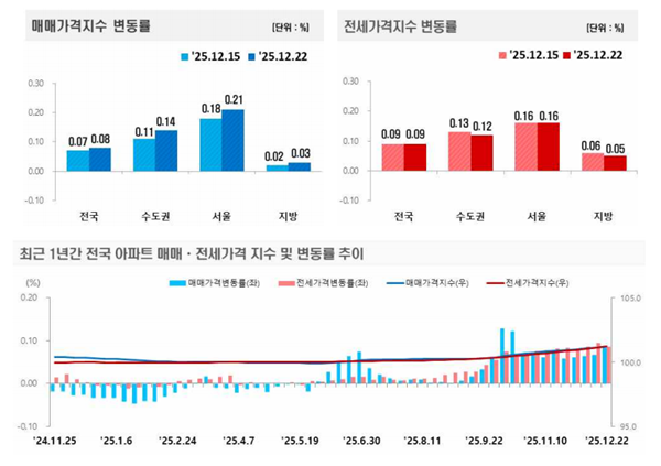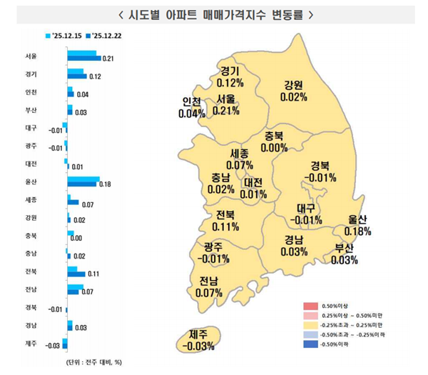[¾ÆÀ¯°æÁ¦=±ÇÇýÁø ±âÀÚ] ÃÖ±Ù Çѱ¹ºÎµ¿»ê¿øÀÌ ¹ßÇ¥ÇÑ ‘ÁÖ°£¾ÆÆÄÆ® °¡°Ýµ¿Çâ’¿¡ µû¸£¸é 2025³â 12¿ù 4ÁÖ(Áö³­ 22ÀÏ ±âÁØ) Àü±¹ ¾ÆÆÄÆ®°ªÀº »ó½Â(0.08%)À» ±â·ÏÇß´Ù. ¼öµµ±Ç°ú ¼­¿ï, Áö¹æ ¸ðµÎ »ó½ÂÇß´Ù.